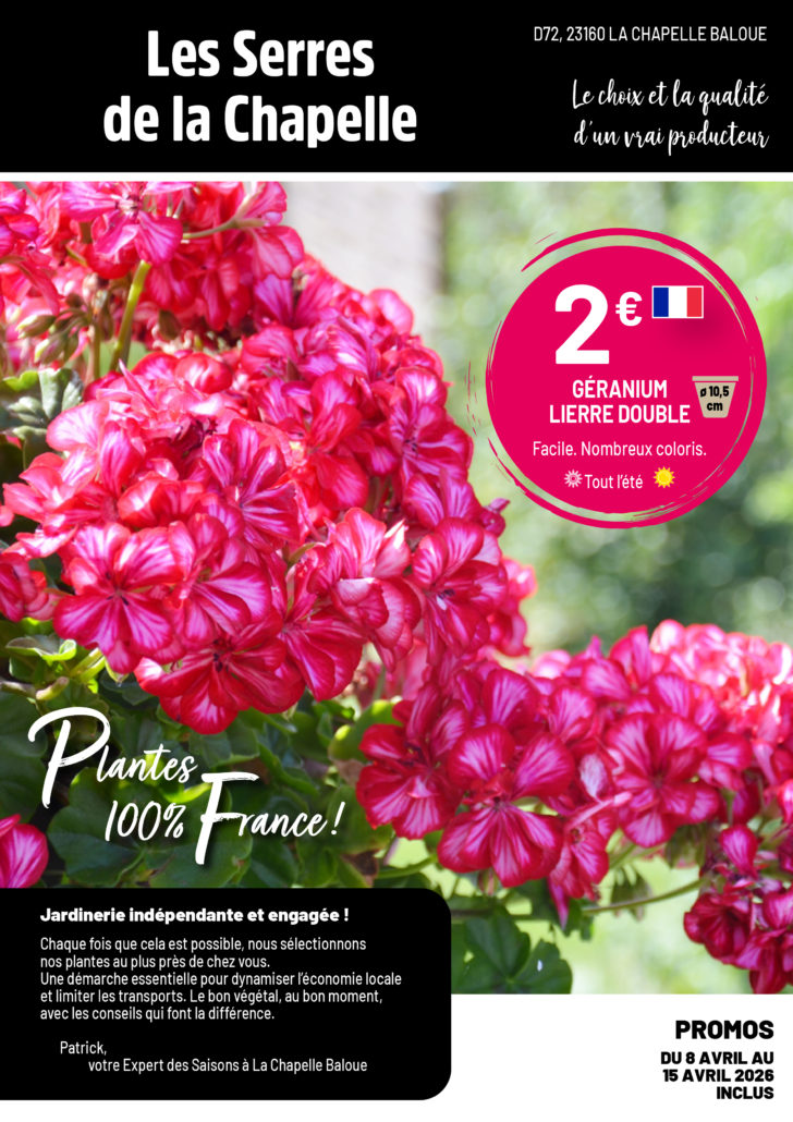 Le printemps est là : il est grand temps de mettre de la couleur à votre extérieur ! Craquez pour notre sélection de fleurs faciles à cultiver (impatiens, géraniums, bégonias…), ainsi que pour notre large choix d’arbustes fleuris, de plantes grimpantes et de plants potagers !